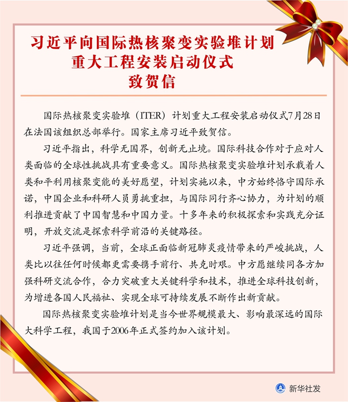 新華社北京7月28日電 國際熱核聚變實(shí)驗(yàn)堆(ITER)計(jì)劃重大工程安裝啟動儀式7月28日在法國該組織總部舉行。國家主席習(xí)近平致賀信。