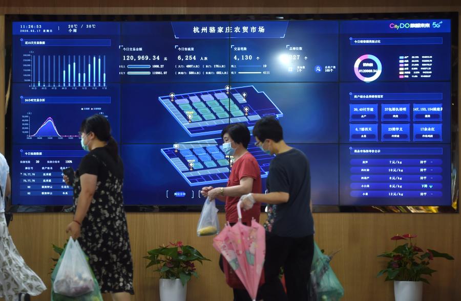 △浙江省杭州市的5G農(nóng)貿(mào)市場——駱家莊農(nóng)貿(mào)市場的大屏幕上實(shí)時(shí)顯示交易、客流等相關(guān)情況(2020年5月17日攝)。新華社記者 韓傳號 攝