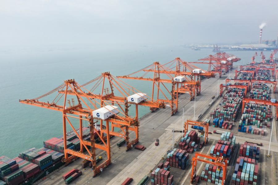 △這是中國(廣西)自由貿(mào)易試驗(yàn)區(qū)欽州港片區(qū)的集裝箱碼頭(2019年11月23日攝,無人機(jī)照片)。新華社記者 曹祎銘 攝