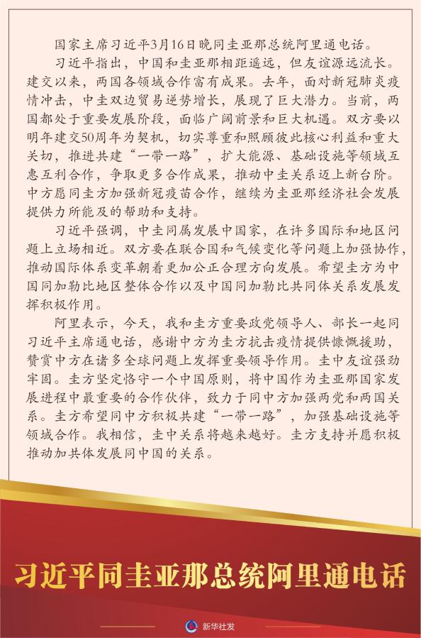 新華社北京3月16日電 國家主席習近平3月16日晚同圭亞那總統(tǒng)阿里通電話。