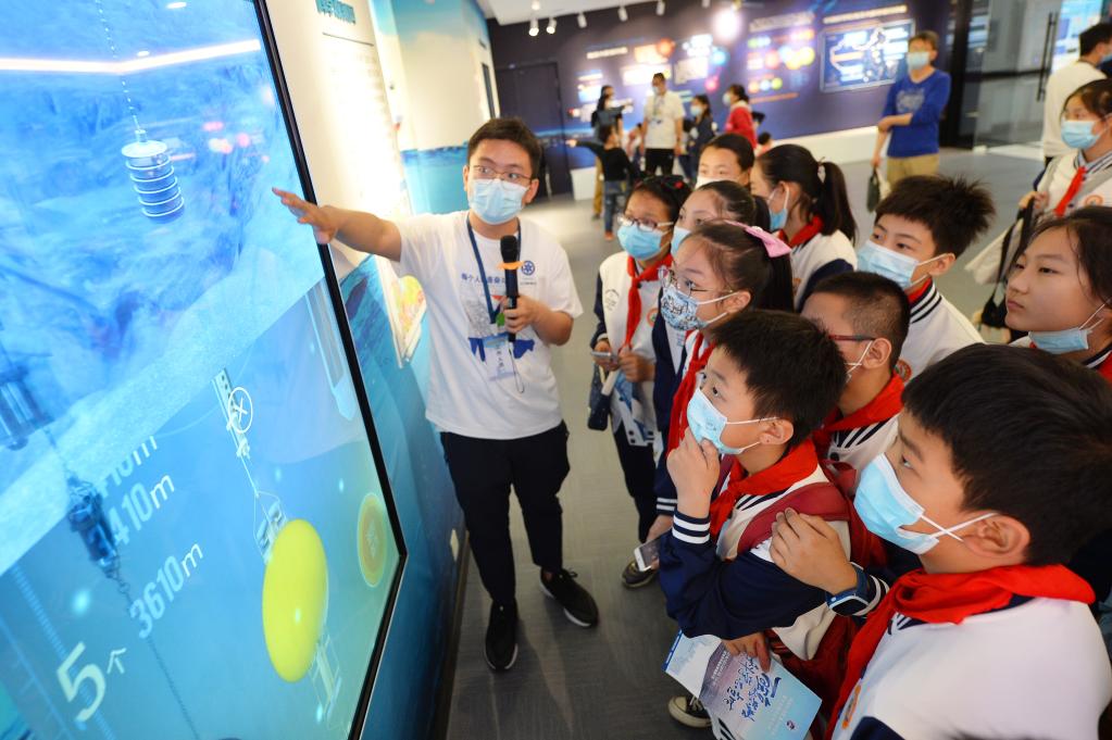 2021年5月22日,中科院海洋研究所科研人員為學生們科普海洋科考船下潛采集標本的相關知識。新華社發(fā)(王海濱 攝)