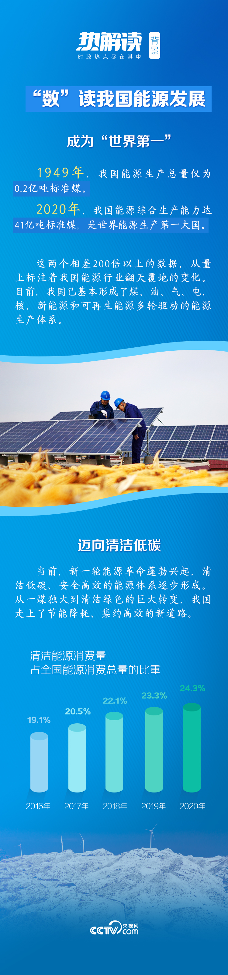 新中國(guó)成立以來(lái),我國(guó)逐步建成較為完備的能源工業(yè)體系。改革開放后,我國(guó)推進(jìn)能源全面、協(xié)調(diào)、可持續(xù)發(fā)展,成為世界上最大的能源生產(chǎn)消費(fèi)國(guó)和能源利用效率提升最快的國(guó)家。黨的十八大以來(lái),我國(guó)的能源發(fā)展進(jìn)入新時(shí)代。
