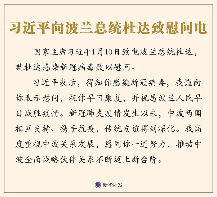 新華社北京1月11日電 國家主席習(xí)近平1月10日致電波蘭總統(tǒng)杜達(dá),就杜達(dá)感染新冠病毒致以慰問。
