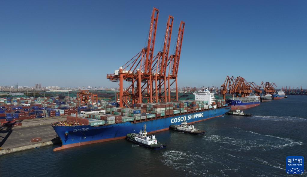 一艘輪船在拖輪的協(xié)助下向唐山港京唐港區(qū)集裝箱碼頭靠泊(2021年10月23日攝,無人機(jī)照片)。新華社記者 朱旭東 攝