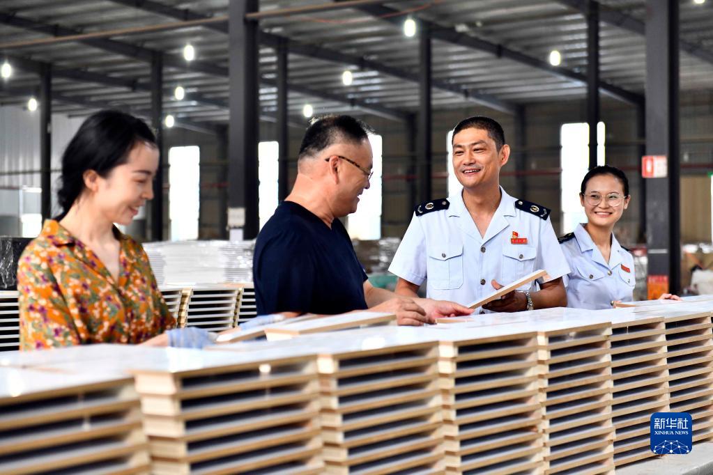 2021年6月16日,在菏澤金然木制品有限公司,山東省菏澤市曹縣稅務(wù)局的工作人員上門走訪,介紹出口退稅相關(guān)優(yōu)惠政策。新華社記者 郭緒雷 攝