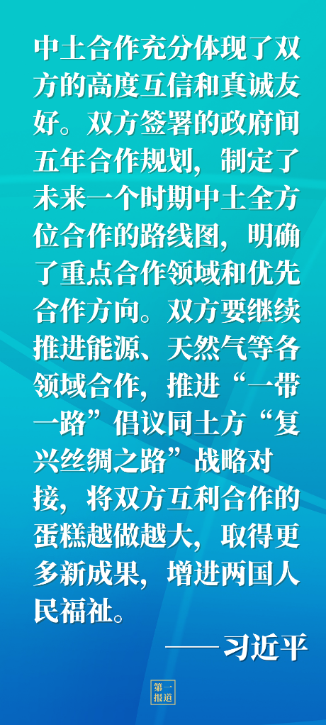 習(xí)近平強(qiáng)調(diào),中土合作充分體現(xiàn)了雙方的高度互信和真誠友好。雙方簽署的政府間五年合作規(guī)劃,制定了未來一個時期中土全方位合作的路線圖,明確了重點合作領(lǐng)域和優(yōu)先合作方向。雙方要繼續(xù)推進(jìn)能源、天然氣等各領(lǐng)域合作,推進(jìn)“一帶一路”倡議同土方“復(fù)興絲綢之路”戰(zhàn)略對接,將雙方互利合作的蛋糕越做越大,取得更多新成果,增進(jìn)兩國人民福祉。當(dāng)前國際和地區(qū)形勢復(fù)雜敏感,雙方要就重大問題及時溝通,密切協(xié)作,相互支持,堅持真正的多邊主義,為促進(jìn)國際關(guān)系民主化和國際公平正義貢獻(xiàn)力量。