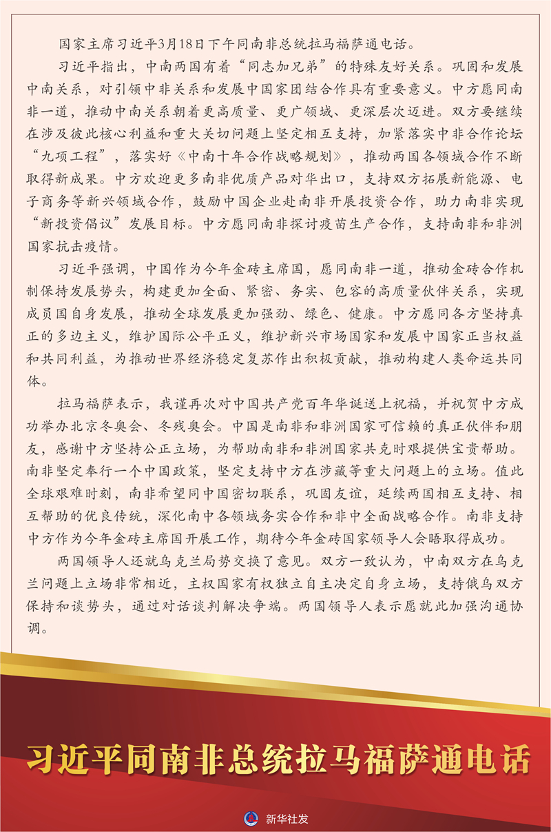 新華社北京3月18日電 國家主席習(xí)近平3月18日下午同南非總統(tǒng)拉馬福薩通電話。