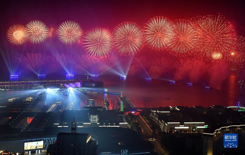 這是上合組織青島峰會(huì)期間舉行的《有朋自遠(yuǎn)方來》燈光焰火藝術(shù)表演(2018年6月9日攝)。新華社記者 李紫恒 攝
