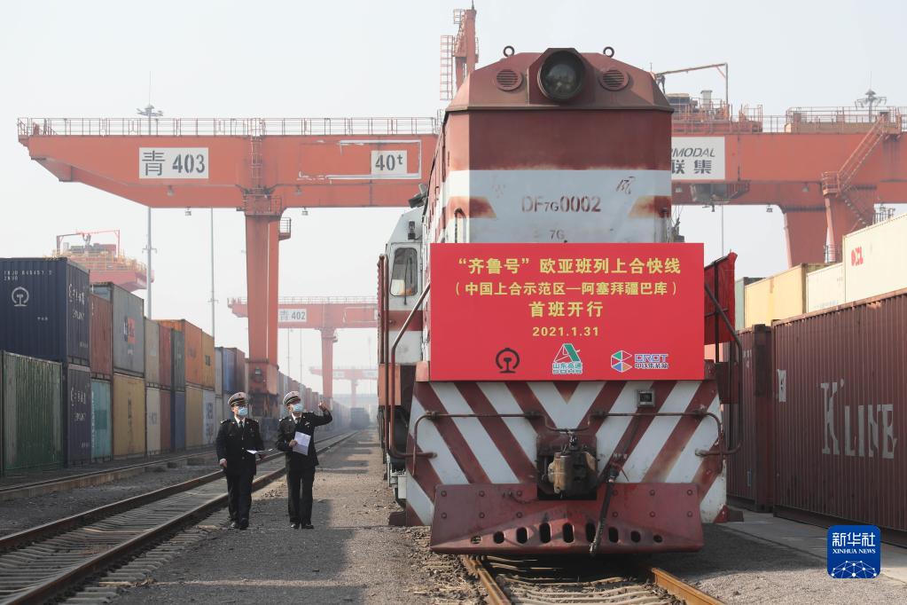 膠州海關(guān)關(guān)員對(duì)“齊魯號(hào)”歐亞班列上合快線(中國上合示范區(qū)——阿塞拜疆巴庫)線路首班列車進(jìn)行檢查(2021年1月31日攝)。新華社發(fā)(解豪 攝)