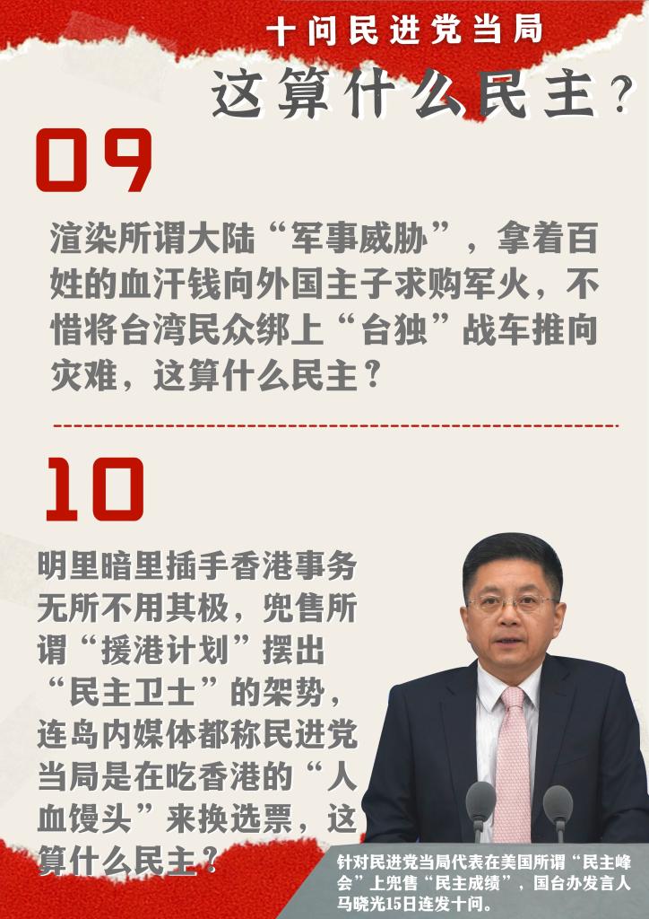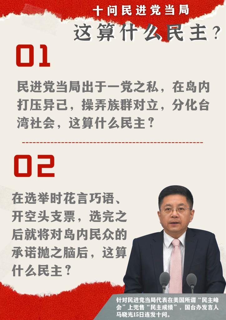 國臺辦發(fā)言人馬曉光15日針對民進黨當(dāng)局所派代表在美國所謂“民主峰會”上兜售臺灣所謂“民主成績”連續(xù)發(fā)問。馬曉光表示,我們要反問民進黨當(dāng)局,他們出于一黨之私,在島內(nèi)打壓異己,操弄族群對立,分化臺灣社會,這算什么民主?