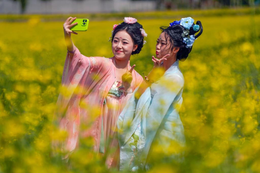 5月4日,身著漢服的游客在河北省遵化市一處花海景區(qū)拍照。 新華社發(fā)(劉滿倉 攝)