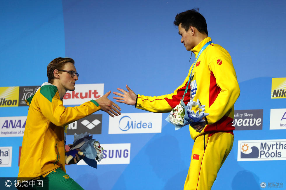 孫楊奪冠后,在混合區(qū)接受完采訪回到熱身池,一路走來受到各國運(yùn)動員、教練員和官員的祝賀,包括日本名將萩野公介等人的問候。到了休息區(qū),他和自己的教練鄭坤良、外教丹尼斯握手擁抱,和中國隊(duì)的教練員們慶祝勝利。