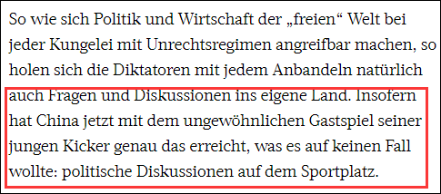 最激進(jìn)的是其極左媒體《法蘭克福評(píng)報(bào)》,它用了一個(gè)《球場(chǎng)上的中國(guó)“斯塔西”》的標(biāo)題,稱“我們可以在球場(chǎng)內(nèi)和中國(guó)年輕球員討論言論自由”。而斯塔西,為東德國(guó)家安全部,曾經(jīng)是世界上非常強(qiáng)大的情報(bào)機(jī)構(gòu)。