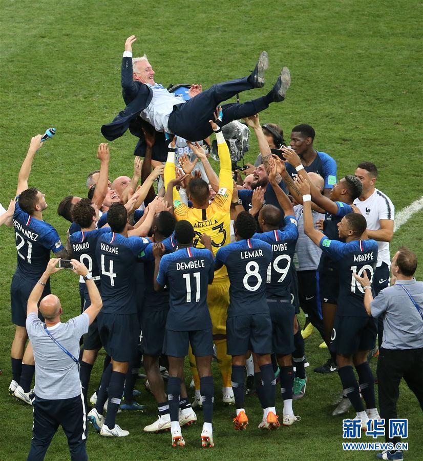 7月15日,法國(guó)隊(duì)球員在比賽后拋起主教練德尚(上)慶祝勝利。當(dāng)日,在莫斯科進(jìn)行的2018俄羅斯世界杯足球賽決賽中,法國(guó)隊(duì)以4比2戰(zhàn)勝克羅地亞隊(duì),繼1998年后再奪世界杯冠軍。 新華社記者李明攝