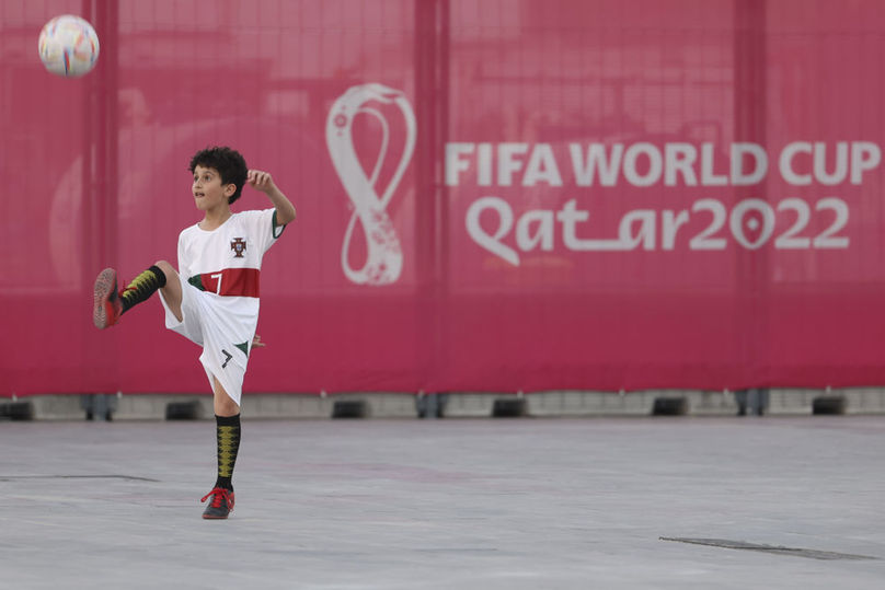 卡塔爾世界杯臨近,多哈街頭的氛圍漸濃,圖為11月8日,一名男孩在多哈瓦基夫市場的空地上踢球。新華社記者李明攝