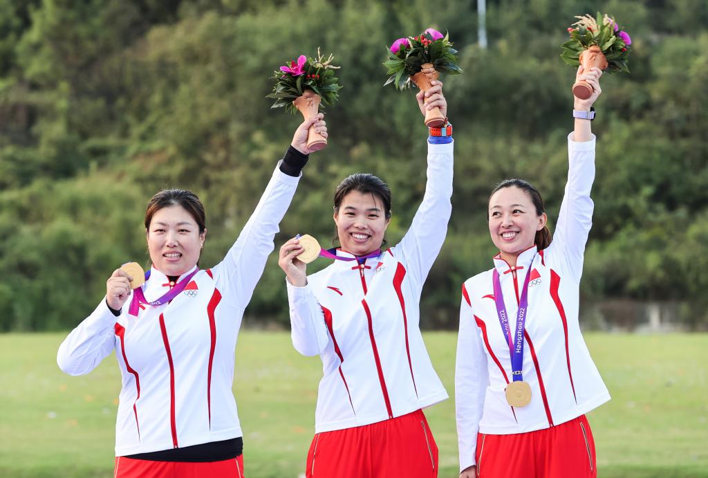 10月1日,中國選手李清念(右)、武翠翠(左)、張鑫秋在頒獎儀式上。新華社記者 單宇琦 攝