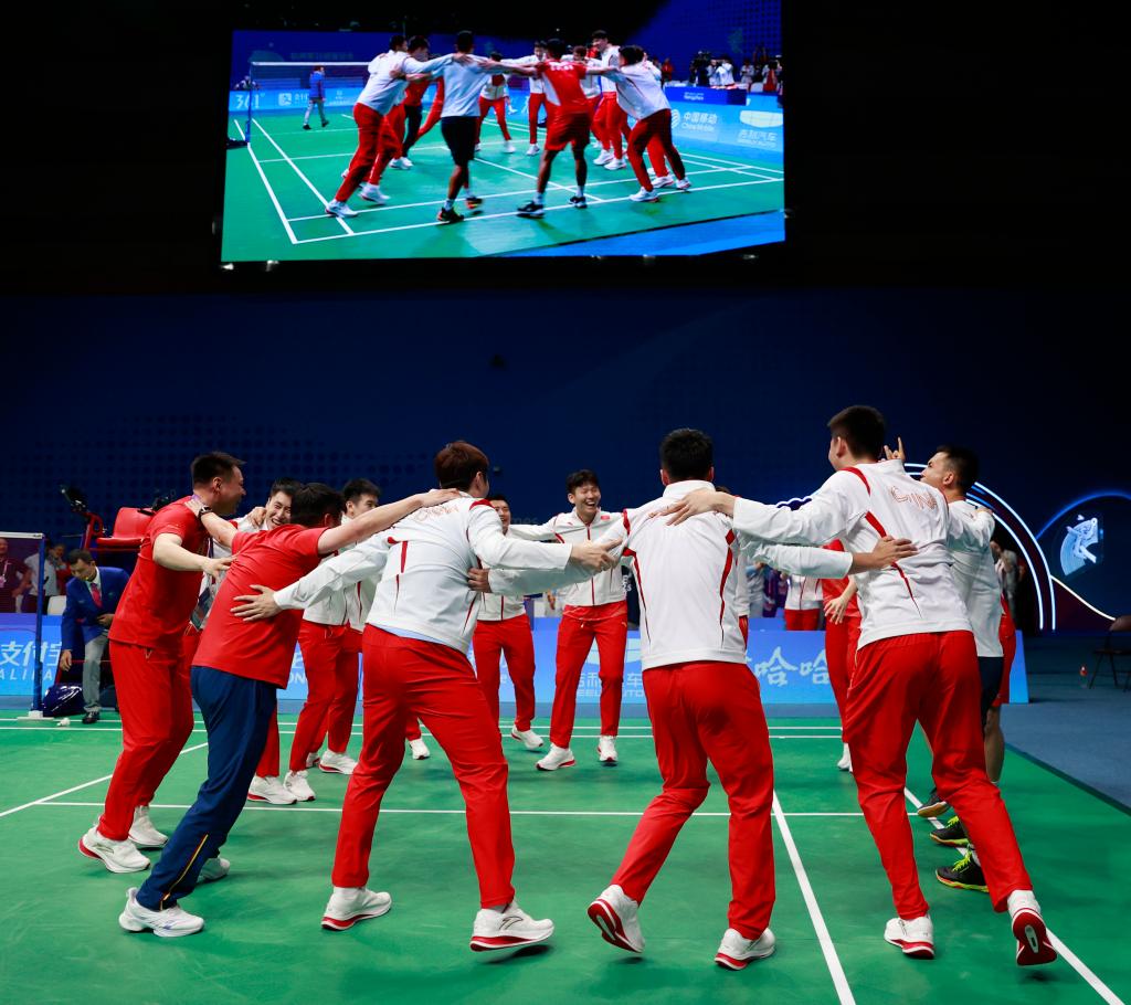 10月1日,中國羽毛球隊在獲勝后慶祝。新華社記者 任正來 攝