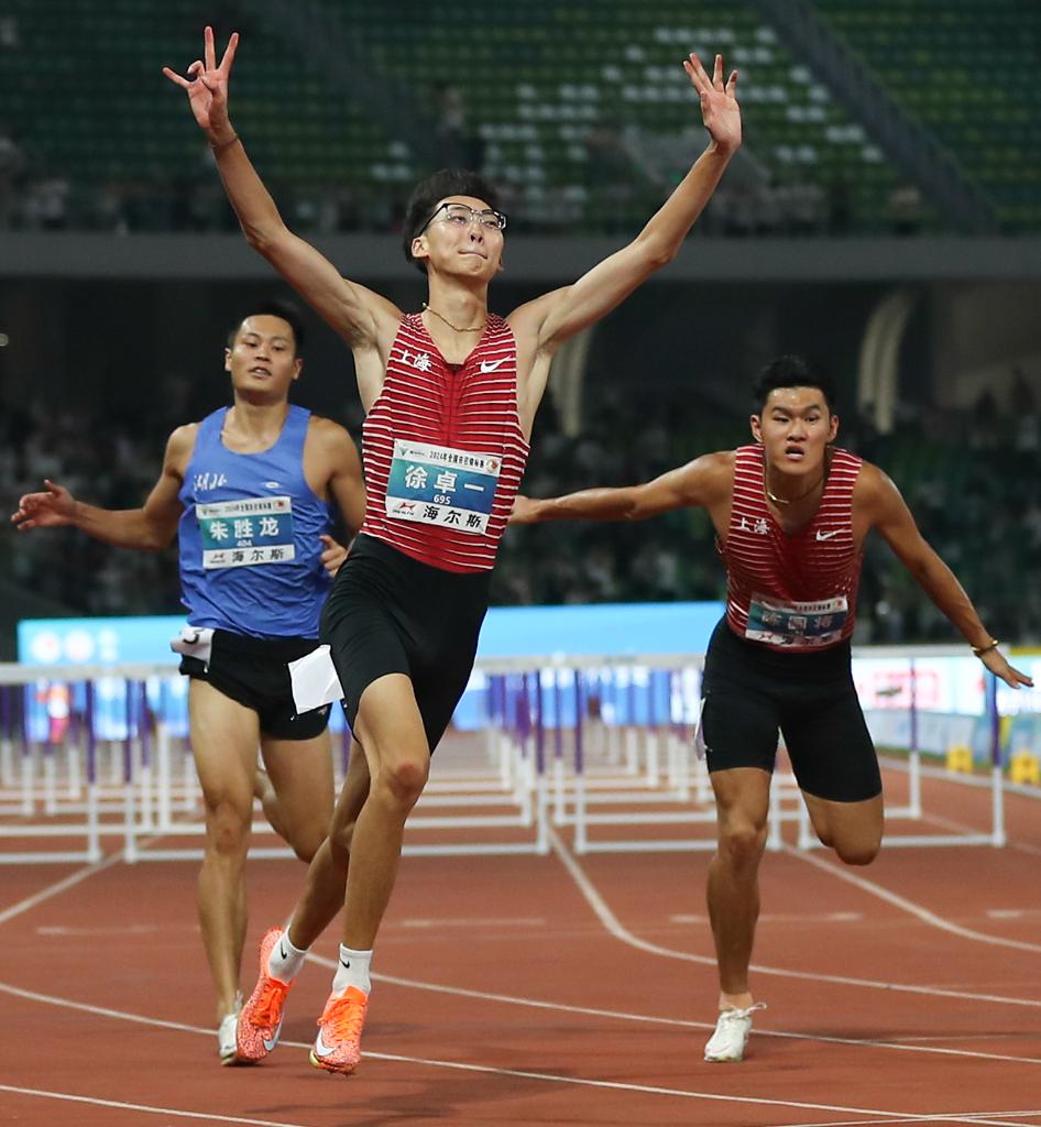 當(dāng)晚率先進(jìn)行的男子110米欄比賽中,上海隊的徐卓一以13秒31的成績拔得頭籌,江蘇隊的劉俊茜以13秒41排名第二。另一位上海隊小將陳圓將以13秒49的成績獲得銅牌。