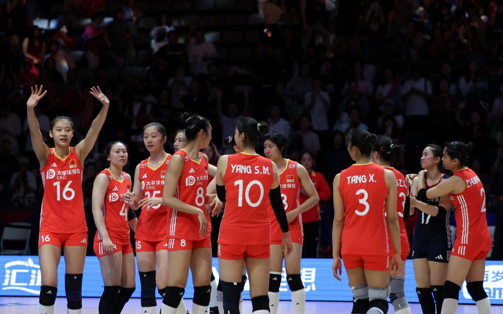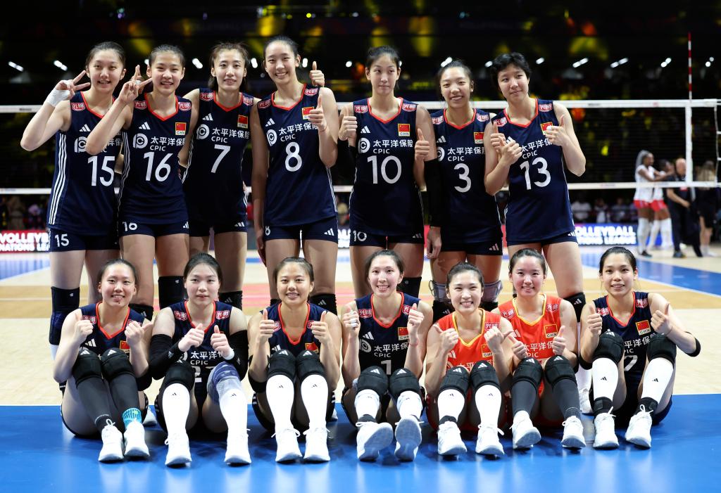 2025年6月7日,在北京舉行的世界女排聯(lián)賽(中國(guó)北京站)小組賽中,中國(guó)隊(duì)3:0戰(zhàn)勝法國(guó)隊(duì)。中國(guó)隊(duì)球員在比賽獲勝后合影。新華社記者 雒圓 攝