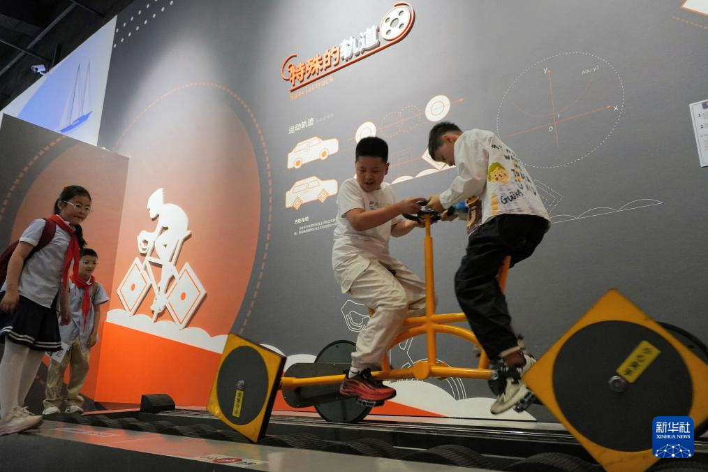 5月24日,小朋友們在山東省科技館體驗方形車輪自行車。