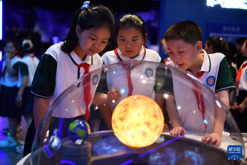 5月25日,山東省青島市市北區(qū)開平路小學(xué)學(xué)生在青島科技館參觀“潮汐”裝置。