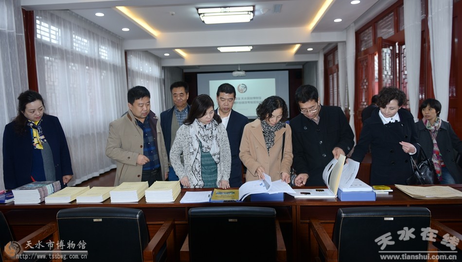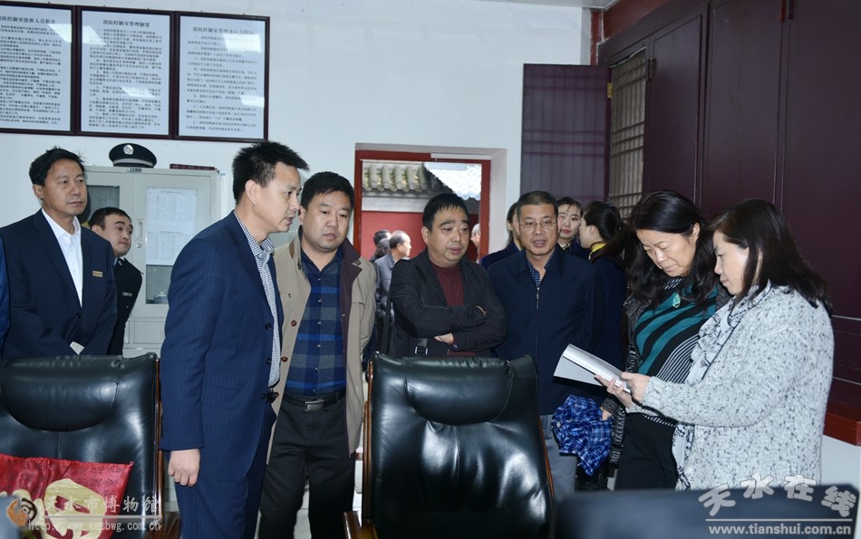 10月24日,由甘肅省文物局博物館與社會文物處處長趙劍飛,省財(cái)政廳科技文化處調(diào)研員劉玉珍,省文物局張瑞軍、郭鵬組成的甘肅省博物館免費(fèi)開放考核小組在天水市文物局局長王國慶的陪同下,對天水市博物館、天水民俗博物館2015年度免費(fèi)開放工作進(jìn)行了考核。市博物館副館長劉玉璞、管玉、汪保全陪同考核。