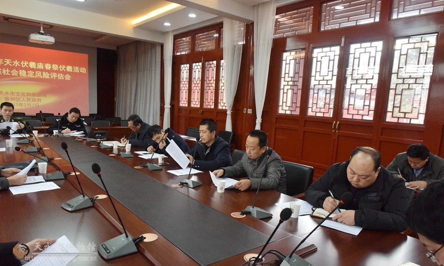 2月7日上午,天水市文化和旅游局、秦州區(qū)政府在市博物館召開2017年伏羲廟春祭伏羲活動社會穩(wěn)定風險評估會議。會議對《吉祥中華——丁酉(2017)年天水伏羲廟春祭伏羲活動總體方案》、《天水市博物館安全保衛(wèi)工作方案》、《2017天水伏羲廟春祭伏羲活動處置踩踏事故應(yīng)急預(yù)案》、《2017天水伏羲廟春祭伏羲活動期間消防應(yīng)急預(yù)案》、《2017天水伏羲廟春祭伏羲活動期間防范和處置恐怖襲擊應(yīng)急預(yù)案》等進行了風險評估。