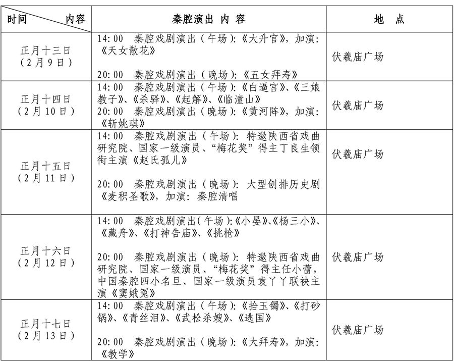 當(dāng)日下午14時(shí),由天水市西秦腔研究院演出的《大升官》、《天女散花》與觀眾見(jiàn)面。從2月9日開(kāi)始,至正月十七日,每天將有兩場(chǎng)秦腔演出,其中夜戲一場(chǎng)。具體內(nèi)容為: