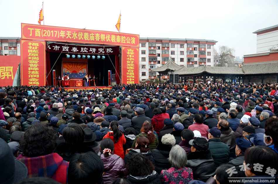 2月13(農(nóng)歷正月十七)日,吉祥中華—丁酉(2017)年天水伏羲廟春祭伏羲活動秦腔公演進入第五天,也是最后一天演出。當(dāng)日午場演出了《拾玉鐲》、《打砂鍋》、《青絲淚》、《武松殺嫂》、《逃國》 ,晚場演出了):《大拜壽》,加演:《教學(xué)》。