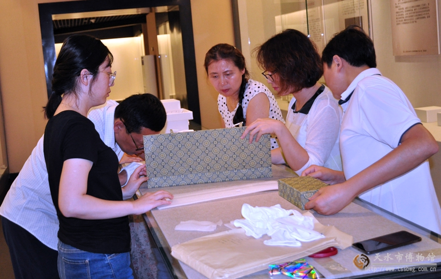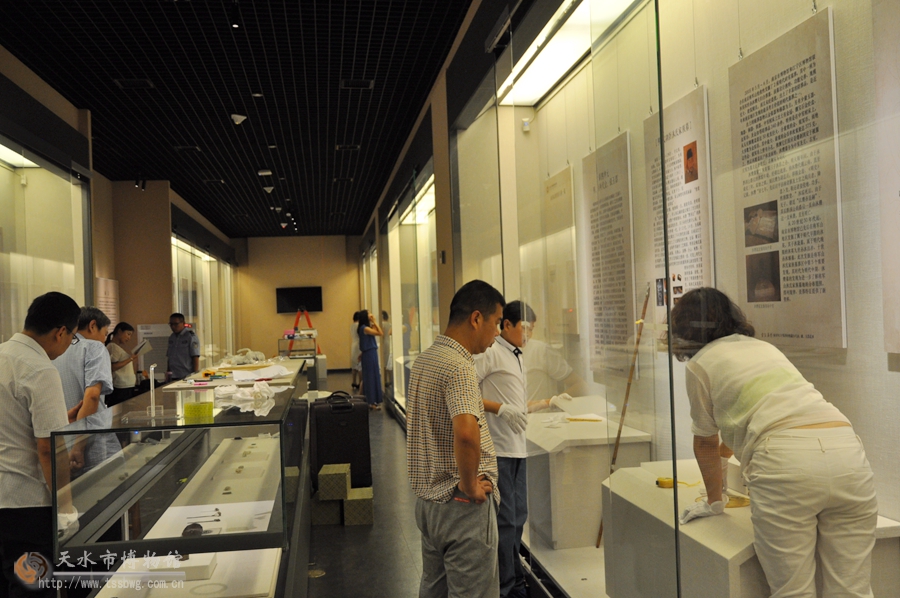 由于此次展覽的文物多數(shù)體量較小,珍貴脆弱,且展覽中需使用大量的輔助展板,為展覽的布展工作帶來了一定的困難。為了布展期間文物的安全,確保展覽按期、順利開展,自8月23日開始,天水市博物館陳展宣傳部就對展覽的形式設(shè)計(jì)、內(nèi)容設(shè)計(jì)進(jìn)行了前期的討論、修改和完善。制作了精美的輔助展板,將展覽所需的所有展臺(tái)、展托、展架、展板在展出文物未抵達(dá)天水之前全部擺放到位,為布展工作創(chuàng)造了有利條件,得到了合作單位的稱贊。