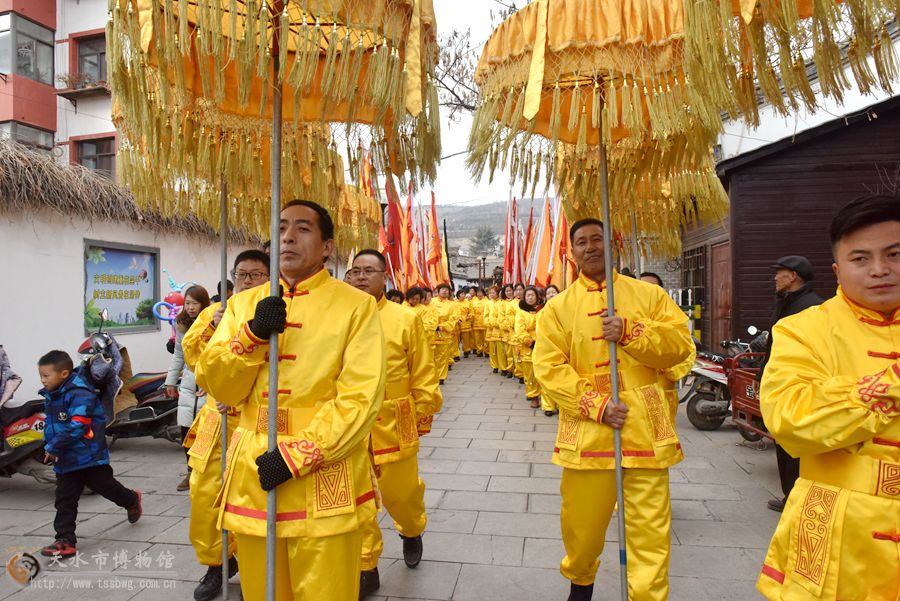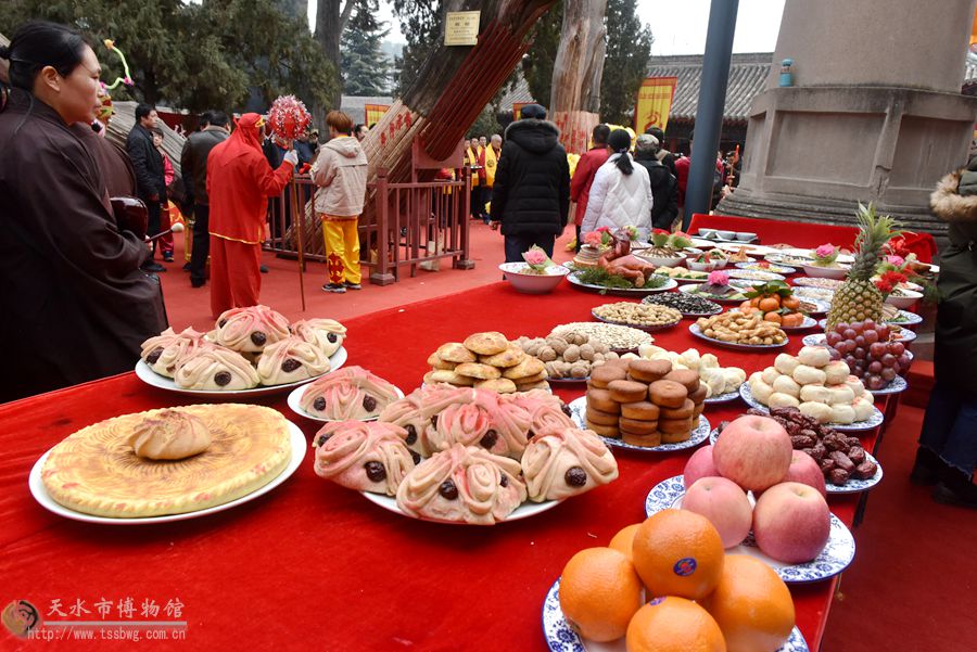 當(dāng)天下午,身著禮儀服裝的祭祀人員抬著盛有牛頭、羊頭、豬頭的“太牢”之禮的食盒和各式菜肴、鮮果,在浩浩蕩蕩儀仗隊伍護送下,繞伏羲城一周。最后,將獻飯迎入伏羲廟,擺放于先天殿月臺東側(cè)供桌上,以備正月十六日凌晨子時典禮時上供。