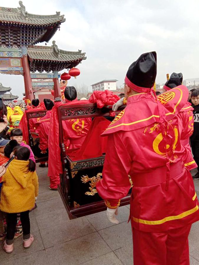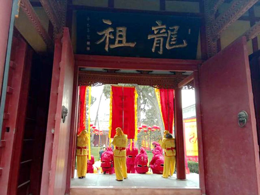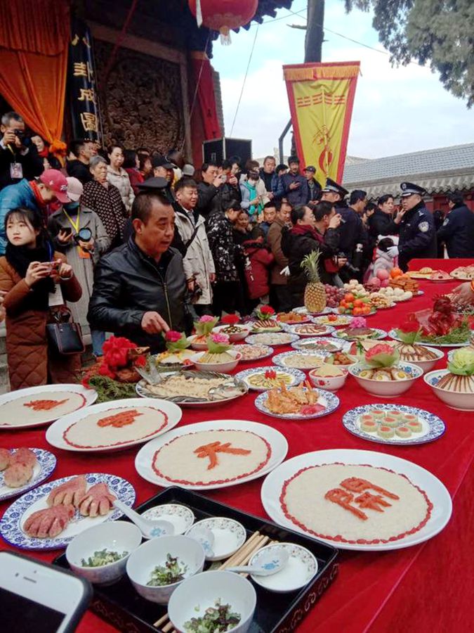 下午四點,“迎獻飯”儀式正式開始,龍舞熙朝、鑼鼓喧天,長龍般的隊伍先繞城一周然后進入了伏羲廟內,人們小心地將山珍海味擺上供臺,舞龍、舞獅、夾板舞等傳統(tǒng)藝術依次都在神位前獻上了最虔誠的表演。