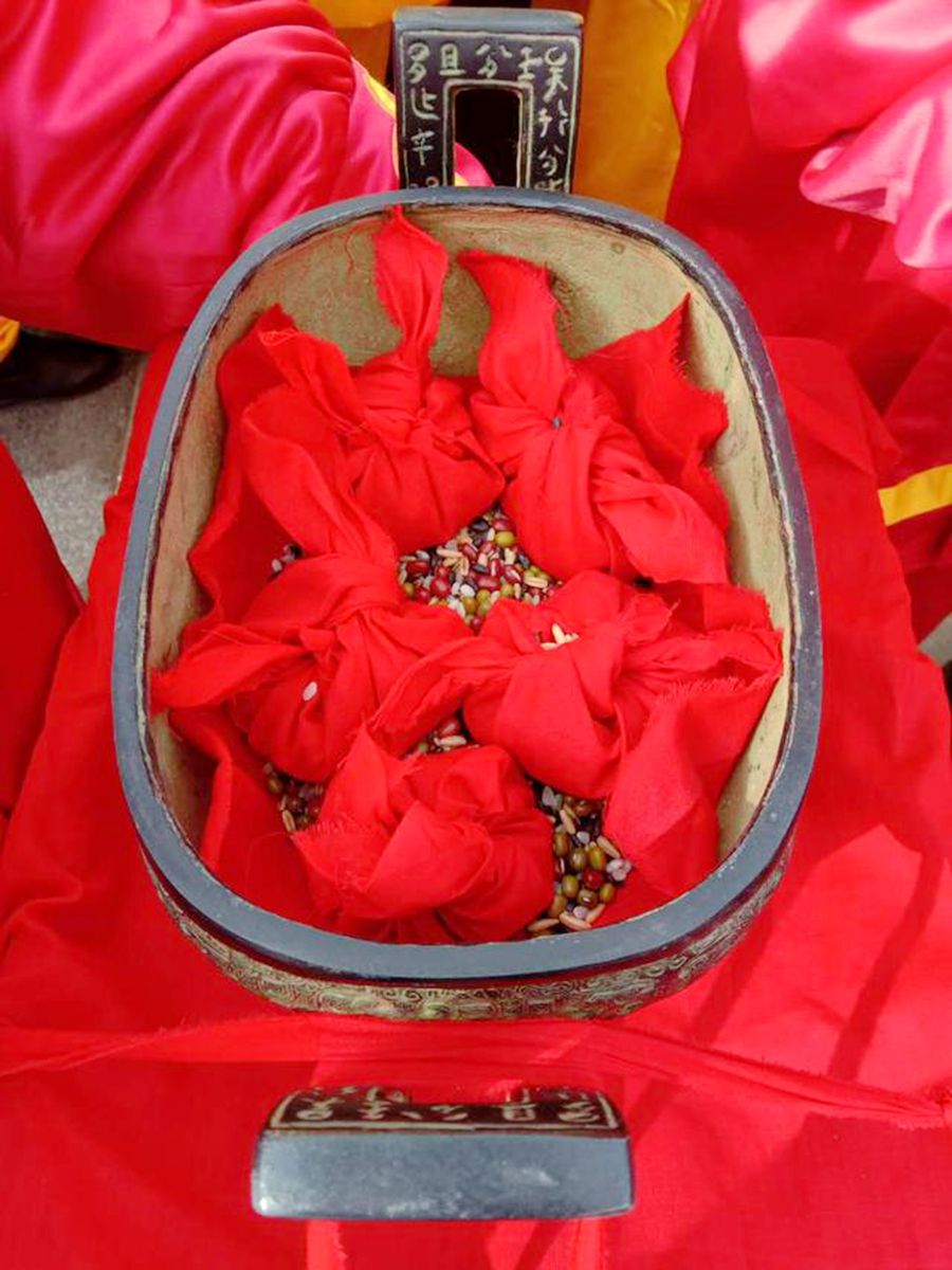 (眾多祭品之一“稷”,鼎中放著五谷,顯示了對伏羲的無上崇拜與人民對生活的無限期望)