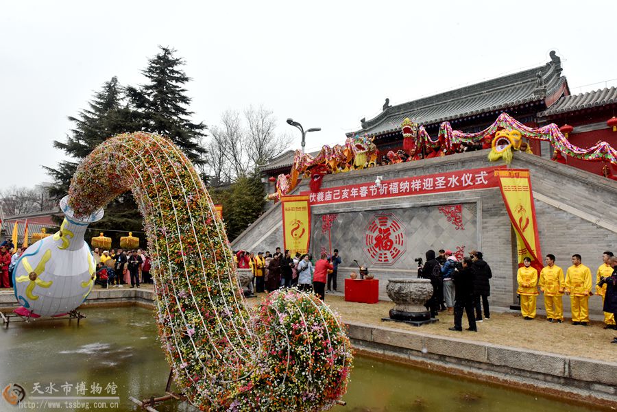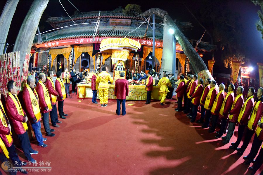 己亥(2019)年2月17日至21日(正月十三至正月十七),天水伏羲廟舉行了春祭伏羲活動。活動以習(xí)近平新時代中國特色社會主義思想為指導(dǎo),以進一步弘揚中華優(yōu)秀傳統(tǒng)文化,增強文化自覺,堅定文化自信為目的,舉行了以傳承中華民族尊祖、敬祖、祭祖的傳統(tǒng)習(xí)俗為主要內(nèi)容的祭祀活動,主要儀程有:出告文、取水供圣、迎神儀式、出榜文、安神儀式、迎獻飯儀式、祭祀典禮、送神儀式等。同時開展秦腔公演、保護維修募捐、燈謎競猜、元宵納福等相關(guān)活動。在此期間,非遺表演和廣大民眾祭祖祈福納祥等民俗活動也相繼呈現(xiàn)。春祭伏羲活動的五天時間里,約30萬人次逛伏羲廟會祭祖祈福看大戲。