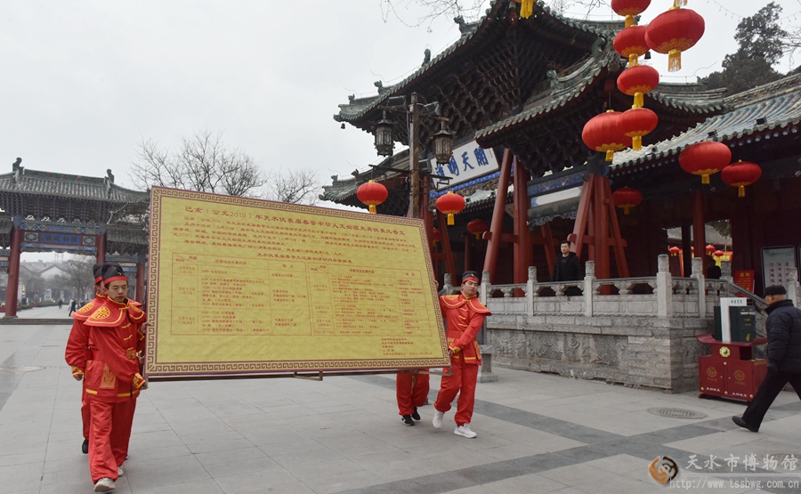 在廟會開始之前,天水市進行了充分準備,2月13日,春祭伏羲活動協(xié)調(diào)會在天水伏羲廟召開,圍繞伏羲廟春祭伏羲活動總體方案,市委宣傳部張建杰部長強調(diào),要講好天水故事,做好天水宣傳,擴大天水影響力和知名度。天水市博物館根據(jù)相關(guān)文件,對春祭伏羲活動期間各崗位工作進行統(tǒng)一安排和部署,明確了崗位職責(zé),確保2019年春祭伏羲活動安全、有序進行。廟會進行期間,全體干部職工恪盡職守,順利完成了本職工作,保障了伏羲廟春祭伏羲典禮圓滿禮成。