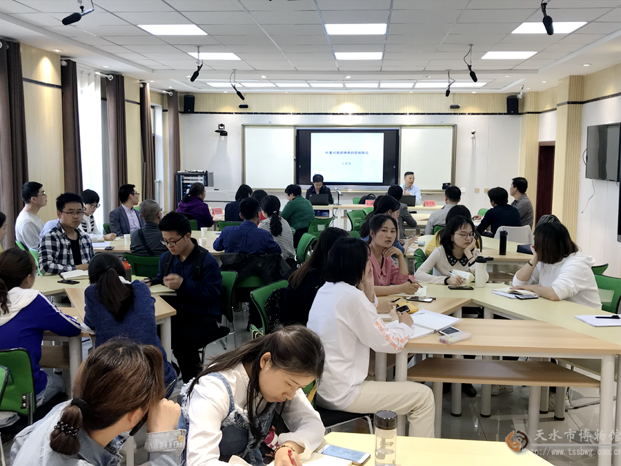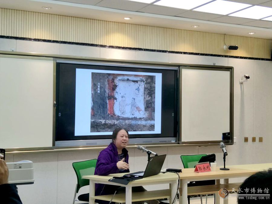 下半場(chǎng)講座由蘭州大學(xué)歷史文化學(xué)院考古學(xué)及博物館學(xué)研究所副教授郭永利主講了《甘肅境內(nèi)的宋金元雕磚壁畫墓及相關(guān)問(wèn)題》,郭教授從甘肅境內(nèi)發(fā)現(xiàn)的雕磚壁畫墓的年代引入,通過(guò)發(fā)掘的墓葬實(shí)物資料從墓室圖像分類、墓室壁畫題材、墓葬形制特征及相關(guān)問(wèn)題等方面進(jìn)行了講授,郭教授認(rèn)為,宋代以雕刻圖像為主,圖像無(wú)邊欄的做法多見,晚期開始出現(xiàn)邊欄;金代以模印加雕刻結(jié)合的形式多見,邊欄的做法非常普遍,隴東、隴中、臨夏地區(qū)均有不同的表現(xiàn),題材以孝子故事、吉祥圖案為主;元代形成了以隴中地區(qū)為中心的模印磚為主的形式,可見有同模所制的圖像,孝子圖像更為流行,在繼續(xù)宋金傳統(tǒng)的同時(shí)以墓主夫婦對(duì)坐、身后置屏風(fēng)、供桌上置寶瓶的元代墓室典型圖像開始出現(xiàn)。講座結(jié)束后,蘭州財(cái)經(jīng)大學(xué)教授王祥偉對(duì)本場(chǎng)講座進(jìn)行了評(píng)議;(dòng)環(huán)節(jié),市博物館職工踴躍發(fā)言,王太職、陳東東與郭教授就天水境內(nèi)發(fā)現(xiàn)雕磚壁畫墓的年代、墓葬的保護(hù)利用、婦人啟門題材的含義、仿木結(jié)構(gòu)雕磚壁畫墓的起源等問(wèn)題進(jìn)行了現(xiàn)場(chǎng)交流,并結(jié)合天水市博物館宋墓復(fù)原展中發(fā)現(xiàn)和需要解決的一些問(wèn)題進(jìn)行了探討。