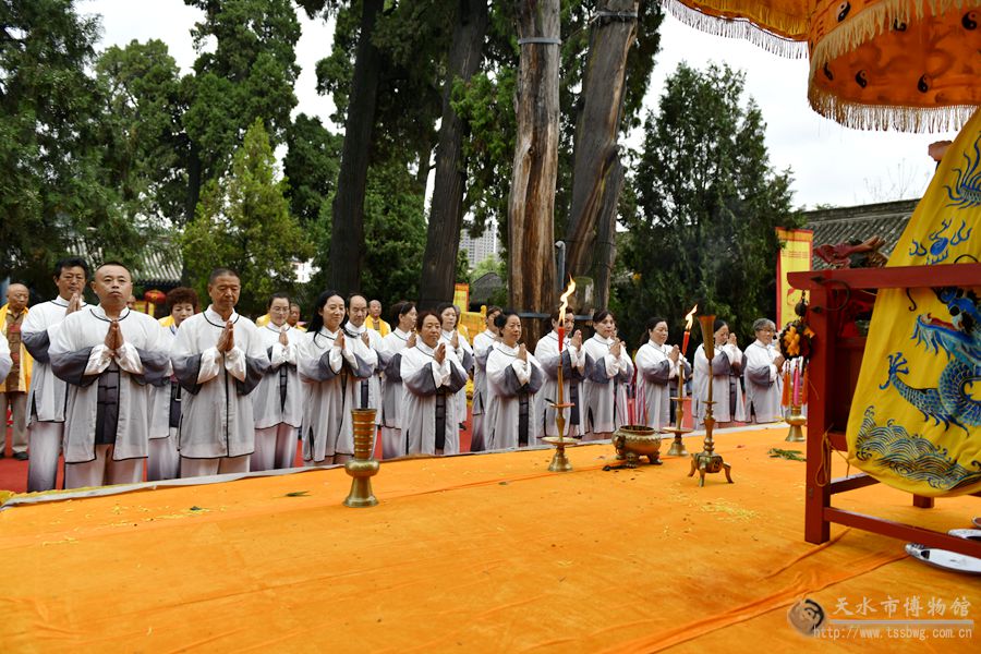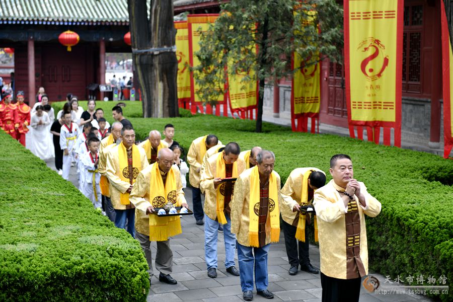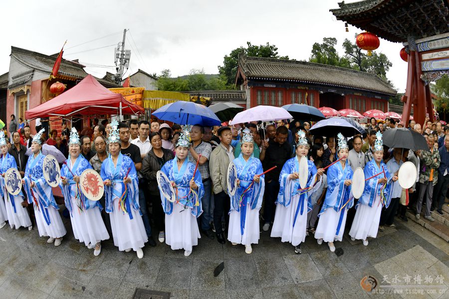 天水是伏羲的誕生地和伏羲文化的發(fā)祥地,天水民間祭祀伏羲典禮作為一種承載本土文化的傳統(tǒng)風(fēng)俗和非物質(zhì)文化遺產(chǎn),歷史悠久。據(jù)史料記載,祭祀伏羲典禮始于秦早期,西漢繼承秦之郊祭制度,東漢沿用此制。唐玄宗開元年間,在京師長安建三皇廟祭祀,逐步規(guī)范了祭祀典范。北宋太平興國初年,天水卦臺山伏羲廟始立廟祀。金章宗明昌年間,卦臺山祭祀伏羲始成規(guī)格,年年祭祀。元代元貞年間,元成宗詔命全國通祀三皇,當(dāng)時卦臺山伏羲廟主祭伏羲,配祀炎帝和黃帝,每年三月三日、九月九日用太牢祭祀,申報禮部,官府出資,官員主祭。明初沿襲元制,民間祭祀并存。明成化十九(公元1483)年,在秦州創(chuàng)建伏羲廟,正德五(1510)年,卦臺山和秦州伏羲廟恢復(fù)春秋官祭活動,祭祀中心由卦臺山移至秦州伏羲廟,卦臺山逐漸變?yōu)槊窦缊鏊<尉付,秦州伏羲廟祭祀活動正規(guī)化、制度化,由朝廷禮部制定程式化祭文,祭祀費(fèi)用列州署財政,制禮作樂,祭祀程序規(guī)范,祭祀活動進(jìn)入鼎盛時期,秦州伏羲廟成為全國規(guī)格最高的祭祀伏羲中心。清代初年,沿襲明代祭祀程序,同時在京師阜成門內(nèi)建歷代帝王廟,祭祀伏羲。清中期以后,祭祀伏羲活動逐漸轉(zhuǎn)為民祭。1988年,天水市政府恢復(fù)公祭伏羲大典以后,至今已成功舉辦30屆。