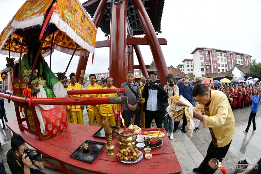 當(dāng)天的送神儀式有請方神黑爺像至伏羲廟先天殿月臺觀禮;在伏羲圣像前明燭、上香、化表、獻(xiàn)茶;方神黑爺像在浩浩蕩蕩儀仗隊簇?fù)硐,出伏羲廟向西繞伏羲城西門一周,至西牌坊前舉行送榜文活動;恭送伏羲神位仙升儀式等。