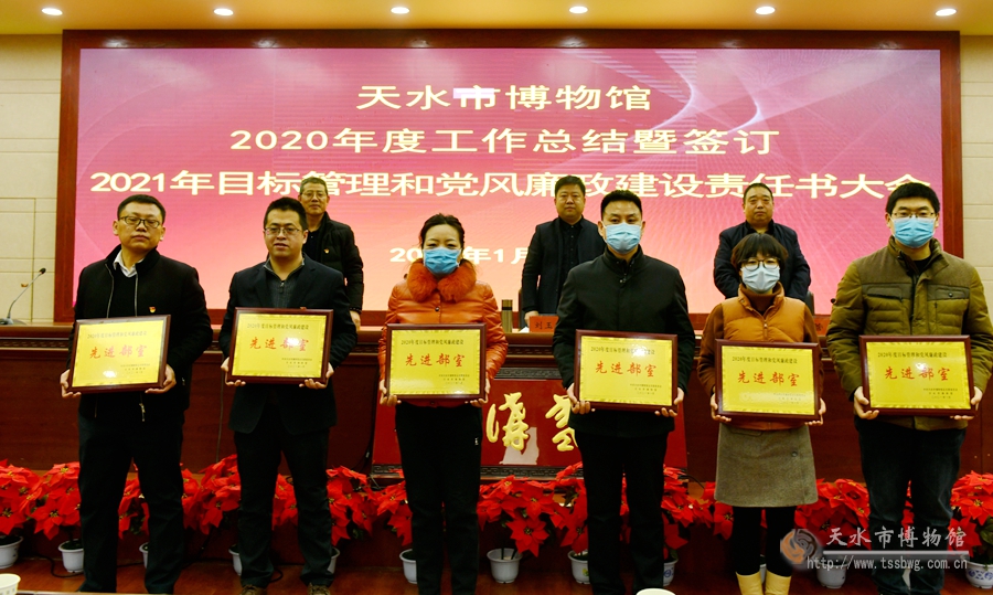 會(huì)上,劉玉璞向全館職工傳達(dá)了全省文物局長(zhǎng)視頻會(huì)議精神;副館長(zhǎng)汪保全宣讀《中共天水市博物館總支部委員會(huì)、天水市博物館關(guān)于表彰2020年度先進(jìn)部室和先進(jìn)個(gè)人的決定》。會(huì)議對(duì)2020年度目標(biāo)管理和黨風(fēng)廉政建設(shè)責(zé)任書(shū)先進(jìn)部室、安全目標(biāo)工作先進(jìn)部室、精神文明建設(shè)先進(jìn)部室、考核優(yōu)秀等次人員以及工作奉獻(xiàn)獎(jiǎng)人員進(jìn)行了表彰。劉玉璞館長(zhǎng)與各部室主任簽訂了《2021年目標(biāo)管理和黨風(fēng)廉政建設(shè)責(zé)任書(shū)》,并就2021年天水市博物館重點(diǎn)工作進(jìn)行了安排部署。