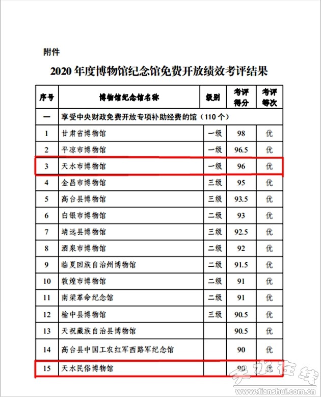 近日,甘肅省文物局、甘肅省財政廳聯(lián)合下發(fā)了《關(guān)于2020年度全省博物館紀念館免費開放績效考評情況的通報》,公布了2020年度全省博物館紀念館免費開放績效考評結(jié)果,天水市博物館在此次績效考評中獲得96分,天水民俗博物館獲得90分,均被評定為“優(yōu)”等次。