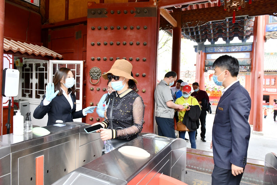 做好疫情防控,游客進(jìn)入前工作人員會提示游客佩戴口罩參觀、檢查健康出行碼,實名登記身份信息。在景區(qū)前后大門口設(shè)置了體溫自動測量儀,游客進(jìn)入后會自動測報體溫,凡體溫合格、有健康碼者即可進(jìn)入游覽。在前后大門旁設(shè)置了臨時“留置觀察室”,如果發(fā)現(xiàn)有發(fā)熱、咳嗽等相關(guān)癥狀的游客,在報告疾控中心的同時,按照相關(guān)要求第一時間進(jìn)行妥善處理。在售票處、大門口設(shè)置了隔離帶,確保游客在排隊入園過程中保持合理距離。對景區(qū)閘機(jī)、通道、游客中心、廁所等一切游客可能觸及到的服務(wù)設(shè)施等進(jìn)行環(huán)境消毒,每天進(jìn)行定時消毒工作,讓旅客放心旅游、愉快旅游。