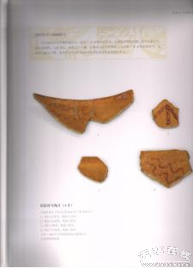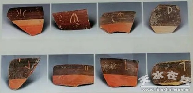 圖注:大地灣遺址出土的陶器上發(fā)現(xiàn)的10多種刻劃符號,有類似水波紋狀的;有類似植物生長的,還有以直線和曲經(jīng)相交的形紋等。這些介于圖畫和文字之間的朱彩符號,為中國的文字起源提供了極為重要的資料和線索。