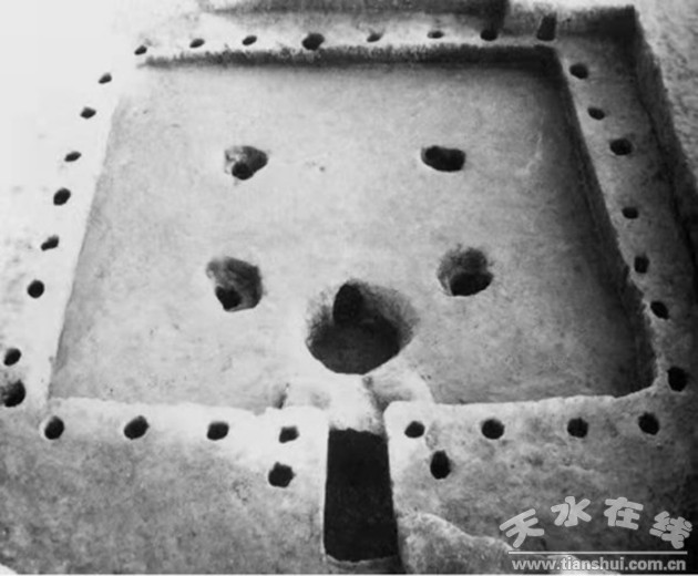 圖注:"F901"的建筑,是目前所見中國史前時(shí)期面積最大、工藝水平最高的房屋建筑。由主室、東西兩側(cè)室和后室、門前附屬物構(gòu)成,總面積420平方米,是中國木結(jié)構(gòu)建筑的典型代表。并在墻壁、門、灶臺(tái)的設(shè)計(jì)布局上還增加了防火保護(hù)層。居住面為料疆和砂石混凝而成的類似現(xiàn)代水泥的地面。布局規(guī)整、中軸對稱、前后呼應(yīng)、主次分明,代表了仰韶建筑的最高成就,開創(chuàng)了后世宮殿建筑的先河。