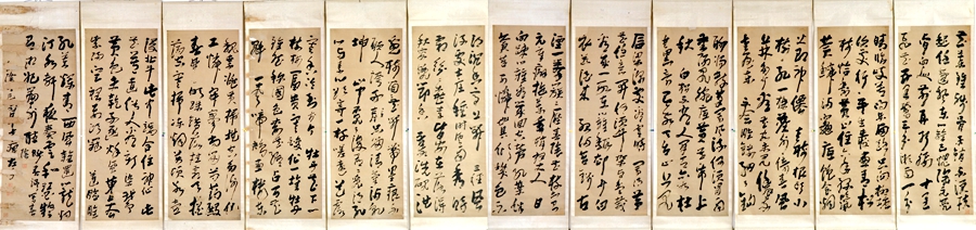 高鳳翰《左手草書十二條屏》,紙本草書。此幅作品共書寫詩(shī)作十七首,為高鳳翰五十五歲右手病殘后所作,是高鳳翰左手書的代表力作?钍稹皻埓郝䦟懘菏a,乾隆丁巳南阜老(人)痹左手!焙筲j“老阜”“高鳳翰印”“西園”白文印,“膠州海上廬法氏珍藏”朱文印。另有白文“海上歸云”引首章,朱文“膠州海上廬法氏珍藏”壓角印。