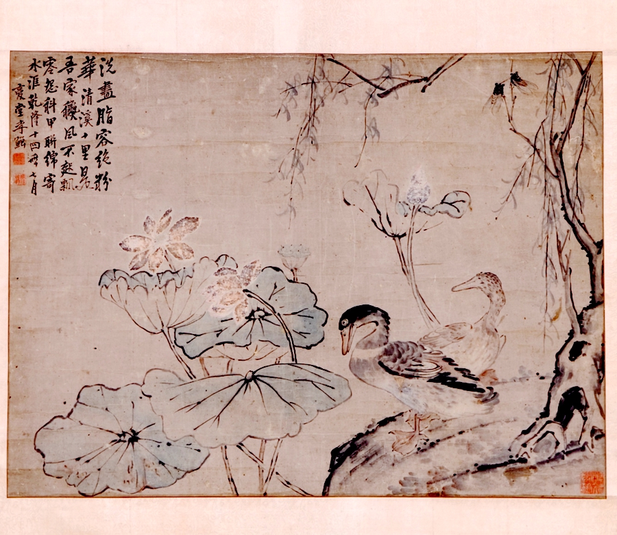 清李鱓《荷鴨圖》軸,紙本設(shè)色。此畫描繪了江蘇興化郊外十里清溪荷塘之景。左上方自題詩(shī):“洗盡脂容絕粉華,清溪十里是吾家。秋風(fēng)不起飄零怨,科甲連綿寄水涯!甭淇睿呵∈哪昶咴,復(fù)堂李鱓。下鈐“鱓印”白文印、“宗楊”朱文印,右下角鈐“李忠定文定子孫”白文印。