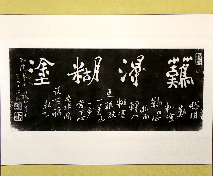 鄭板橋“難得糊涂”石刻拓本條山。小字釋文:“聰明難,糊涂難,由聰明而轉(zhuǎn)入糊涂更難。放一著,退一步,當(dāng)下心安,非圖后來(lái)福報(bào)也。乾隆辛未秋九月十有九日,板橋!庇疑辖氢j“橄欖軒”朱文引首章,左下角鈐“鄭燮之印”、“七品官耳”朱文印。