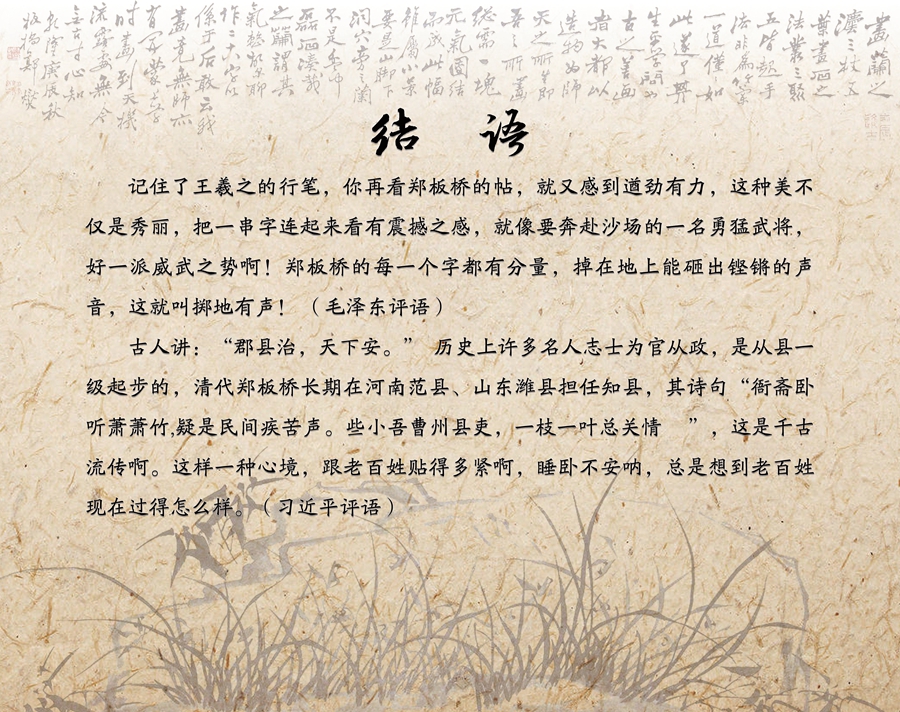 鄭板橋的詩(shī)書畫,人稱“三絕”。他的詩(shī)文,直抒血性,同情人民,鞭撻丑惡,像 《逃荒行》《還家行》《思?xì)w行》,堪與杜甫的“三吏”“三別”相媲美。他的書法,怒不同人,獨(dú)創(chuàng)一格,以隸楷為主、篆隸楷行相參、并雜以蘭竹畫法入書,自稱“六分半書”。他的繪畫,師法造化,繼承傳統(tǒng),多繪蘭竹石,尤精于竹。畫蘭,秀葉疏花,極具姿致;畫竹,瀟灑勁秀,形神俱足;畫石,峭拔瘦硬,昂然向上。再配以點(diǎn)睛之題跋,極富哲理,有“鄭竹、鄭蘭”之譽(yù)。