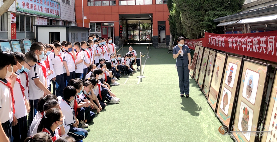 在天水市實(shí)驗(yàn)小學(xué)操場,我館宣教人員結(jié)合天水市博物館“鑄牢中華民族共同體意識(shí)”宣傳展覽,為全校師生講述“淘氣淘器”背后的故事。 \