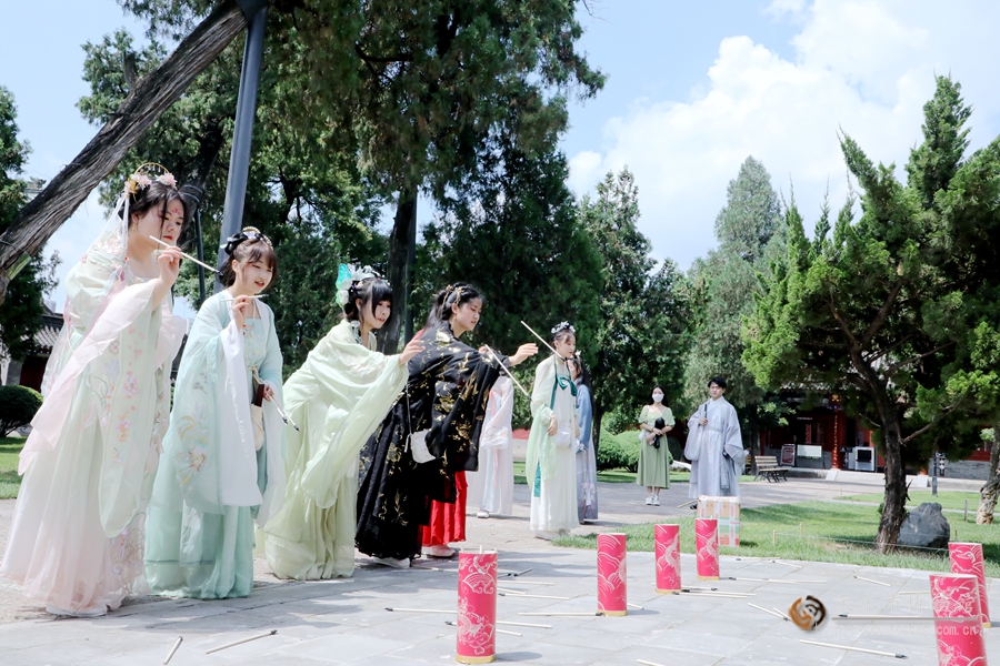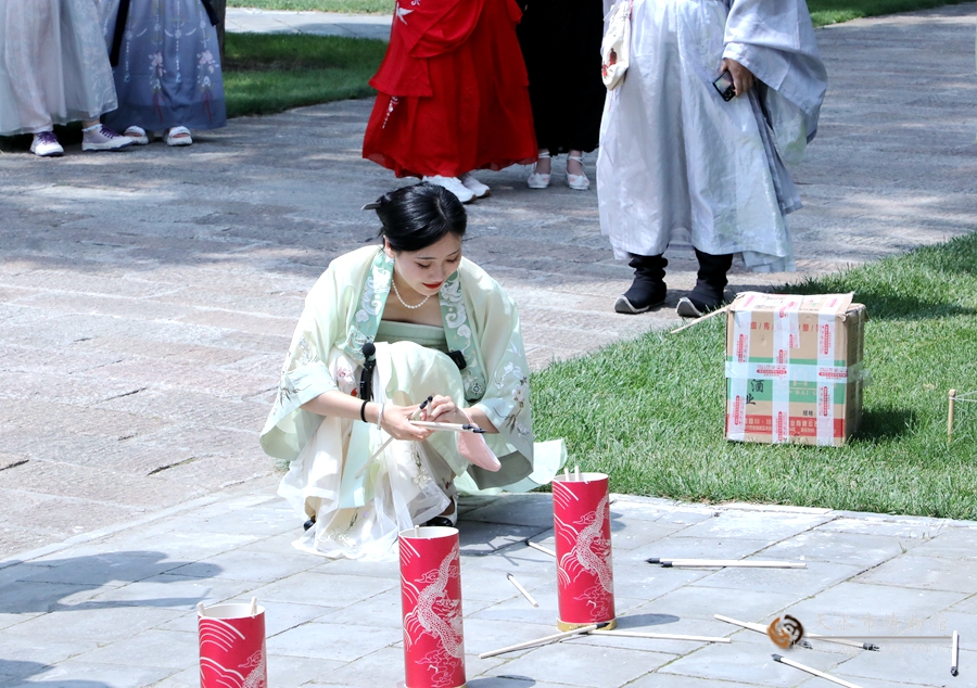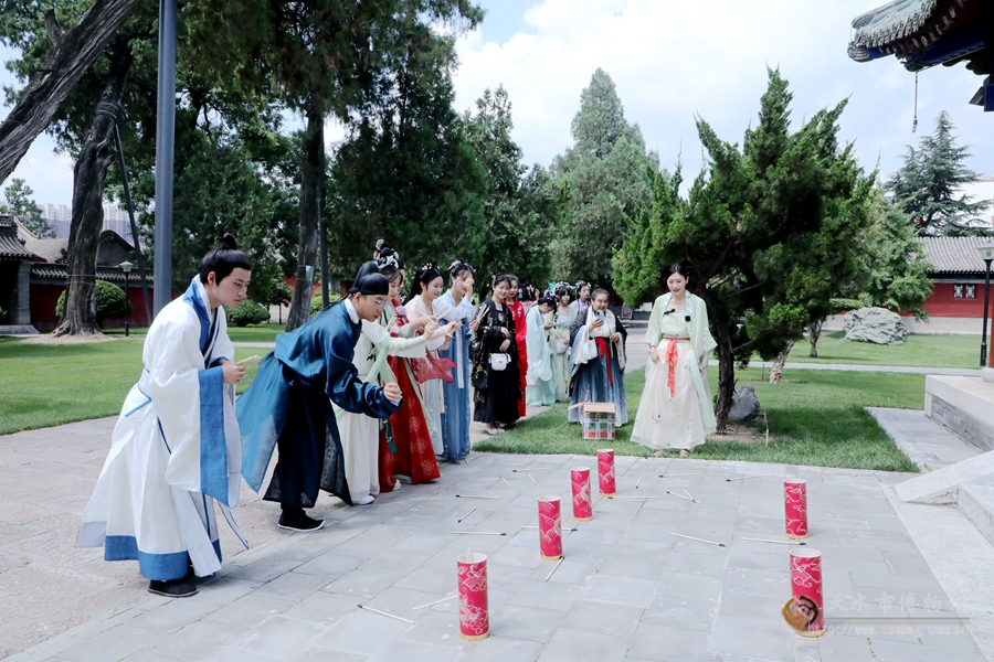 本期活動共分為三部分:首先,由博物館宣教人員帶領(lǐng)大家參觀了伏羲廟,了解伏羲文化,并舉行祭祀儀式,緬懷先祖。隨后,宣教人員向大家依次介紹了“七夕”的由來及習(xí)俗,并細(xì)致地講解了投壺游戲的起源、發(fā)展、禮儀及規(guī)則等。最后,大家一起進(jìn)行了投壺體驗(yàn),感受了古人生動有趣、豐富多彩的文化娛樂生活。