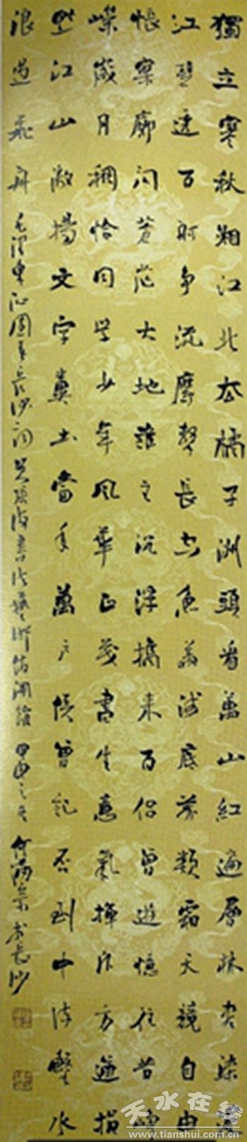 內(nèi)容釋讀:獨立寒秋,湘江北去,橘子洲頭?慈f山紅遍,層林盡染;漫江碧透,百舸爭流。鷹擊長空,魚翔淺底,萬類霜天競自由。悵寥廓,問蒼茫大地,誰主沉。繑y來百侶曾游,憶往昔崢嶸歲月稠。恰同學(xué)少年,風(fēng)華正茂;書生意氣,揮斥方遒。指點江山,激揚文字,糞土當(dāng)年萬戶侯。曾記否,到中流擊水,浪遏飛舟?